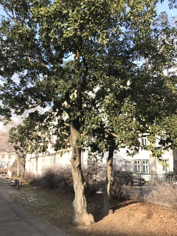 Obwohl ich dort mehrmals pro Woche lang gehe, ist mir die Eiche erst heute aufgefallen - eigentlich habe ich mich nur gewundert, welcher immergrüne Laubbaum in der Größe hier gedeiht.