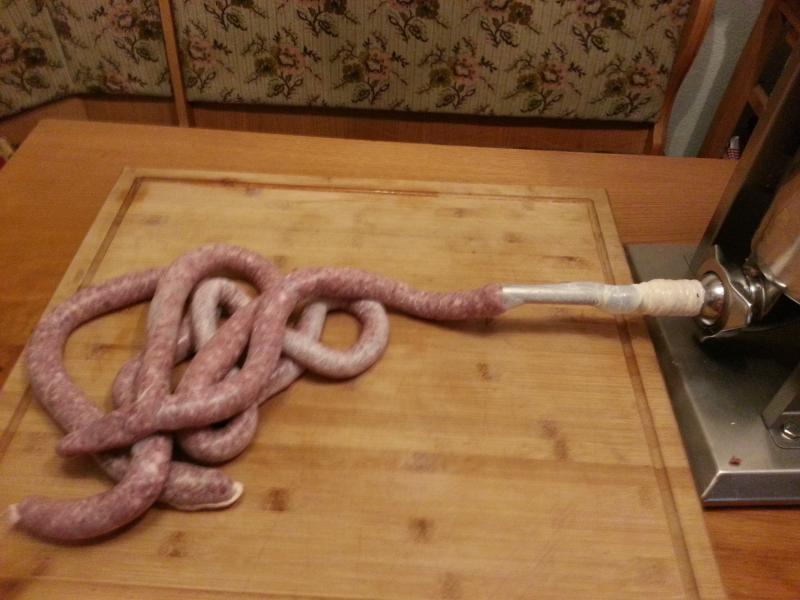 Wurstmasse und aufgezogener Darm, der wird vorher gewaschen - bäh - und wie Präser ;D aufgezogen - auch bäh und Fummelkram