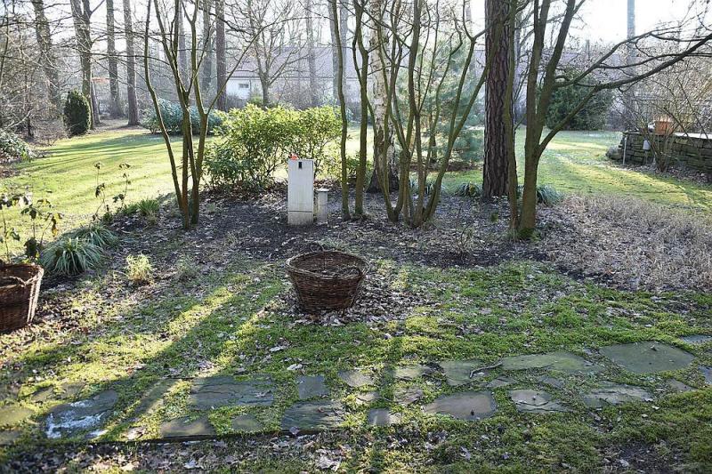 Im Osten steht am Grundstücksrand eine riesige Eiche, die den ganzen Bereich morgens beschattet. Im Westen steht das Haus. Im Süden stehen neben einer Föhre und der Birke ein Rhododendron (Cunningham White). Mittendrin stehen diverse Feldahorn, die ich schon etwas aufgeastet habe.