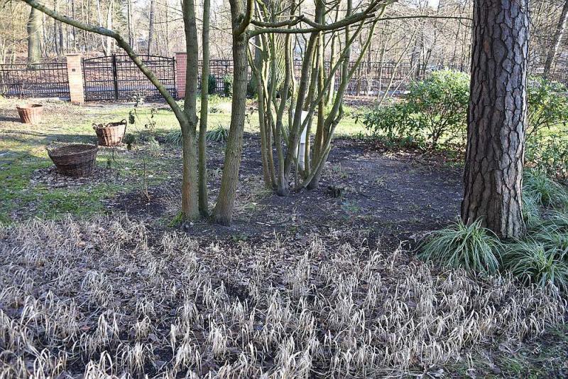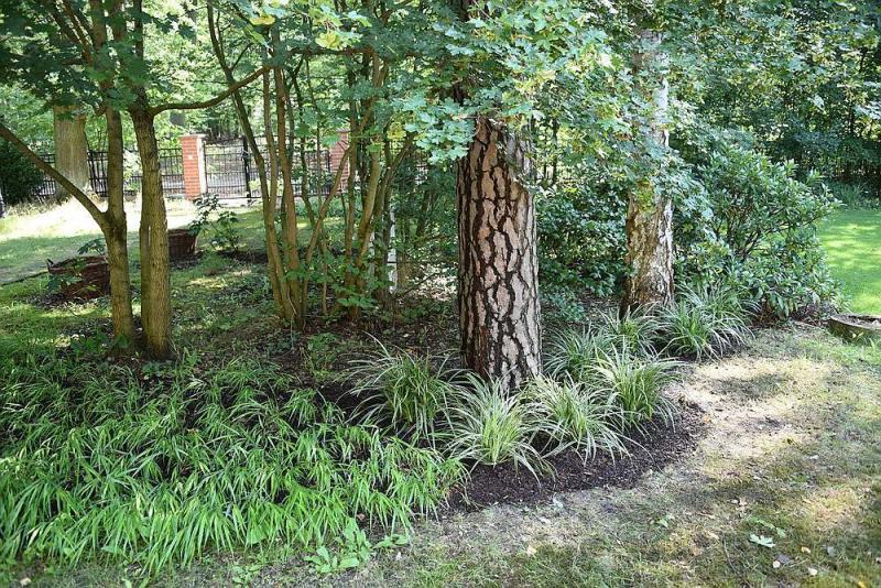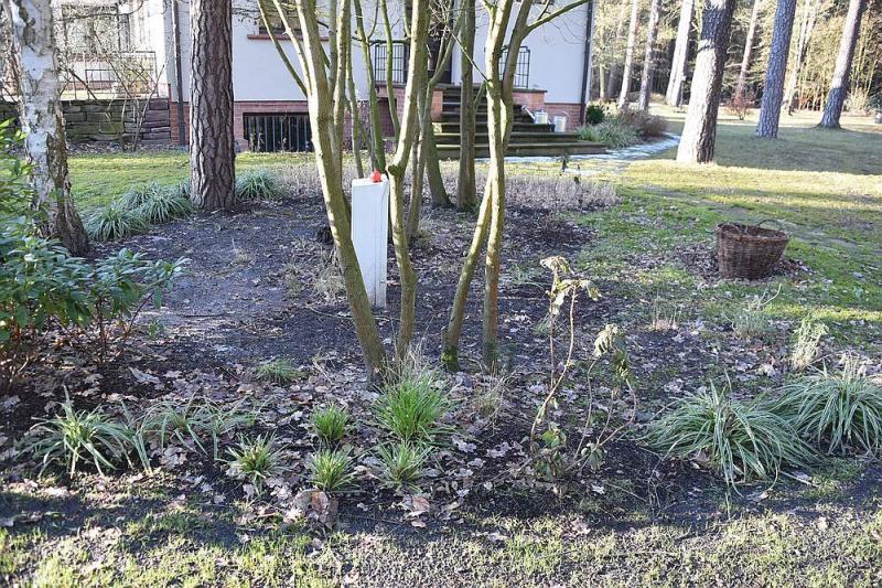 Bereits gepflanzt wurden drei Eichenblättrige Hortensien und auf der westlichen Seite 200 Hakonechloa macra. Außerdem ein paar Carex morrowii ssp. foliosissima 'Irish Green' sowie mehrere Carex morrowii variegata (am Fuß der Föhre). Außerdem sind schon diverse Schneeglöckchem im Boden.