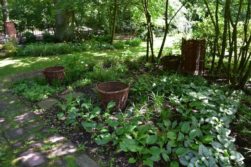 Der Boden ist relativ sauer (pH 5.5) und die gesamte Fläche läßt sich über ein Beregnungssystem bewässern, wobei das Brunnenwasser wiederum ziemlich kalkhaltig ist (15° dH). Mein unsprünglicher Plan war die Pumpe mit einem Geflecht aus Weiden – oder Haselnussästen zu verdecken, die Weidenkörbe auf den Gullideckeln zu lassen und die Fläche großzügig zu bepflanzen mit: