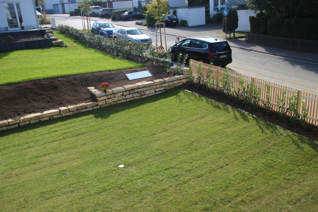 Meint Ihr, es ist denkbar, einen Feuerahorn in die rechte Gartenecke (da wo auf dem Foto das Schild liegt) auf das Hochbeet zu pflanzen? Der Abstand vom Stamm zur Natursteinmauer wäre 1 Meter. Oder werden die Wurzeln des Baums die Natursteinmauer umdrücken? Die Mauer ist momentan nur aufgestapelt, man könnte sie aber ggf. auch noch von hintnen betonieren.