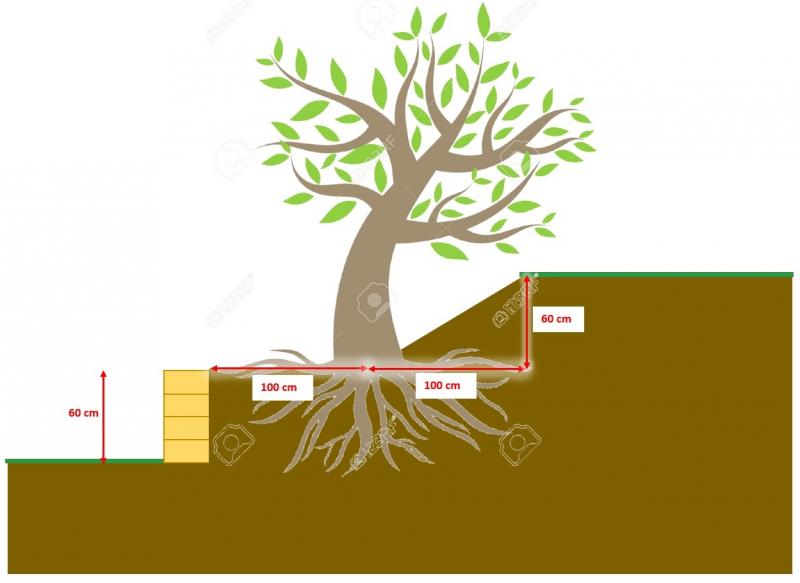 Abgesehen vom Problem, wie groß der Baum wachsen wird, bleibt die Frage: Was passiert bei einem Pflanzort auf der Böschung im Konflikt zwischen Wurzeln und Mauer? Wird der Baum nicht richtig wachsen, weil zu wenig Platz für die Wurzeln ist? Werden die Wurzeln die Mauer umschmeißen?