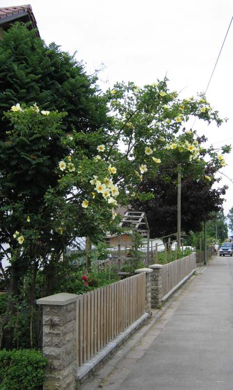 Ich möchte mich hier zwar nicht als Rosenfachmann deklarieren, aber Mermaid ist eine Kletterrose, die bis zu 8 m hoch werden kann. Diese super Rosensorte kennt man an ihren Rosa-banksiae-Holz, hat leider einen kleinen Nachteil, dass sie nämlich nur in wintermilden Gebieten über die Runden kommt. Bei meinen Eltern in Südbaden steht eine Mermaid an der Westseite des Hauses, seit über 10 Jahren. Ich tippe daher auch auf Frühlingsgold.