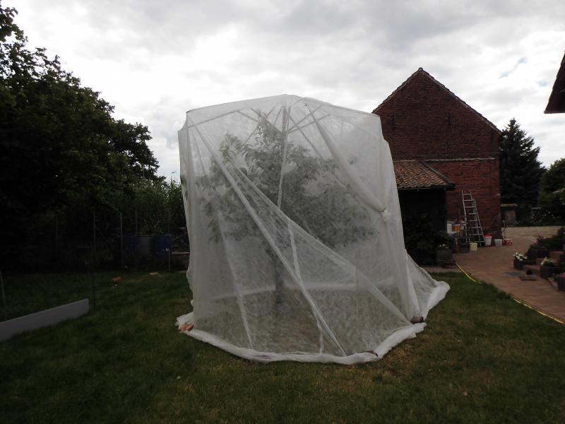 in Sonnenschirmgestell aus dem Gastroabfall (etwa um 1920 und vom Sperrmüll, heute aus Metall aber viel häufiger zu kriegen da das nicht lange hält) und Frostschutzvlies aus dem Gemüsebau (12m breit) reicht bis etwa 4m Baumhöhe. Vlies ist viel leichter und stabiler als diese Netze!