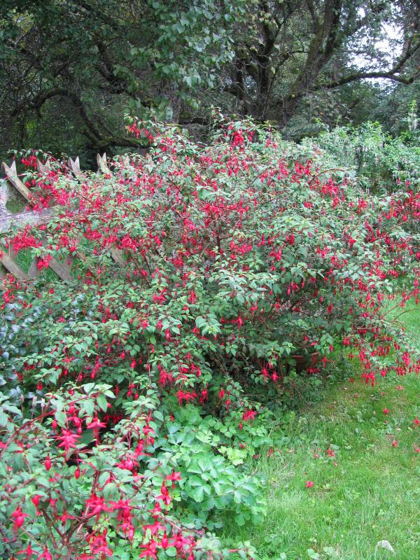 In Tonboden, 7b und unter Nachbars Apfel-, Birn- und Zwetschgenbäumen habe ich winterharte Fuchsien. Die blühen ab Juli, es ist die Sorte Fuchsia magellanica var. ricatonii. So optimal wie auf dem Bild sehen sie aber nicht immer aus. Fuchsien wollen eigentlich keine Wurzelkonkurrenz.