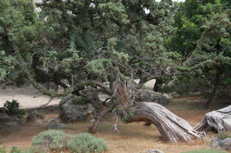 In der Nähe von Elafonissi ist ein kleines Naturschutzgebiet mit alten Wacholdern, Kedrodasos. Da führt der E4 entlang. Der Strand dort ist traumschön, über den dürfte man eigentlich öffentlich nichts schreiben, und dann noch die alten, knorrigen Bäume!