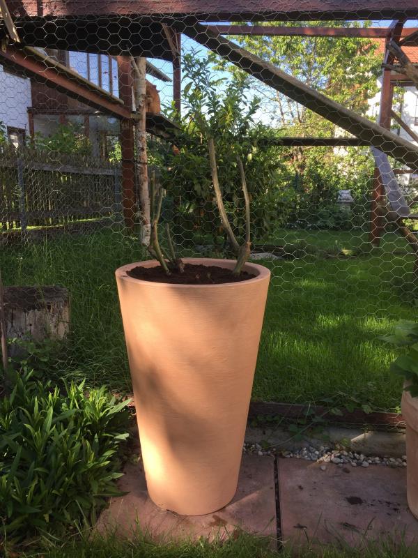 Der Nachbar war nicht zimperlich, als er die Rose vor einer Woche aus dem Beet geholt und in den viel zu kleinen Topf gepackt hat. Ich hoffe, daß da noch Feinwurzeln dran sind. Hab grad hohen günstigen Rosentopf erstanden, Rosenerde ebenfalls und mach mich mal ans Werk.
