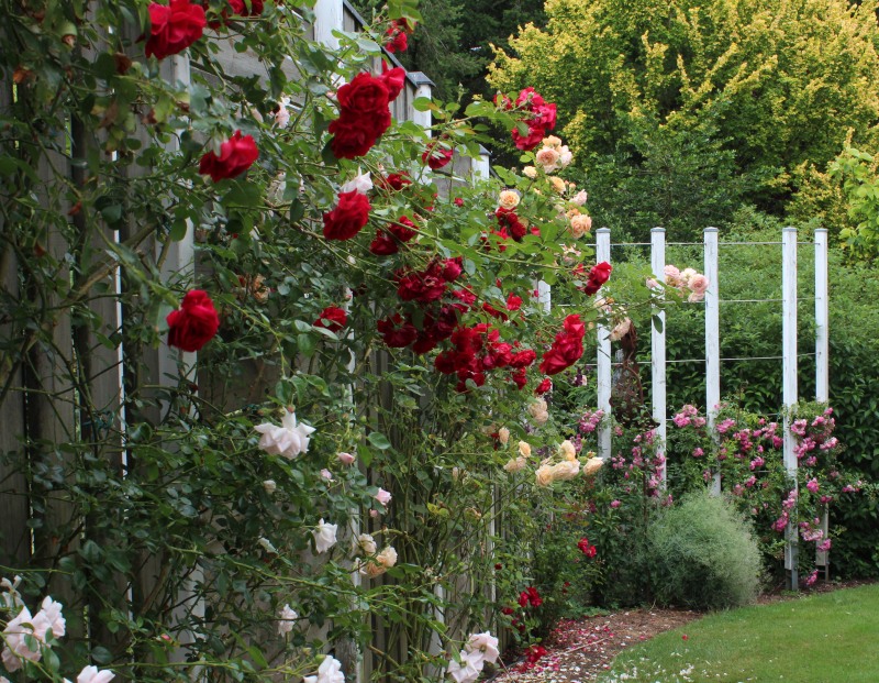 Zum Charles Austin kann ich sagen, dass er einer von diesen hier ist. Am Rosenweg in Bahlingen, wo viele Strauch- und Kletterrosen an hohen Pfählen befestigt sind, einige sind regelrecht herumgewickelt. Jedenfalls weiss ich noch, dass der Charles damals bei 3m Höhe am Ende des Pfahls nicht Schluss machen wollte und deutlich oben weitergewachsen ist. Aber unten kahl war er nicht, jedenfalls nicht so, wie man das von Sympathie kennt.