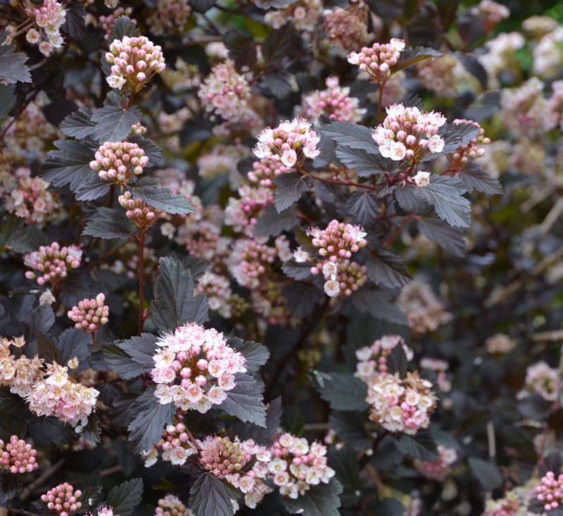 Schnellwachsend sind Physocarpus Diabolo mit schöner Rotfärbung und cremigen Blüten (allerdings auch ein paar Früchte im Herbst)