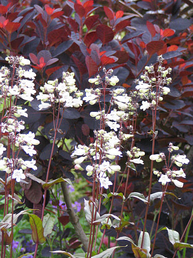 "Penstemöner" sind so schön filigran, wie sie mit ihren zarten Blütchen über den Stengeln schweben ...Ein sicheres Bild von Penstemon hirutus kann ich auch liefern ... muß nur noch etwas kramen.Einstweil Penstemon digitalis 'Huskers Red', der vor dem Hintergrund des roten Cotinus wunderbar leuchtet