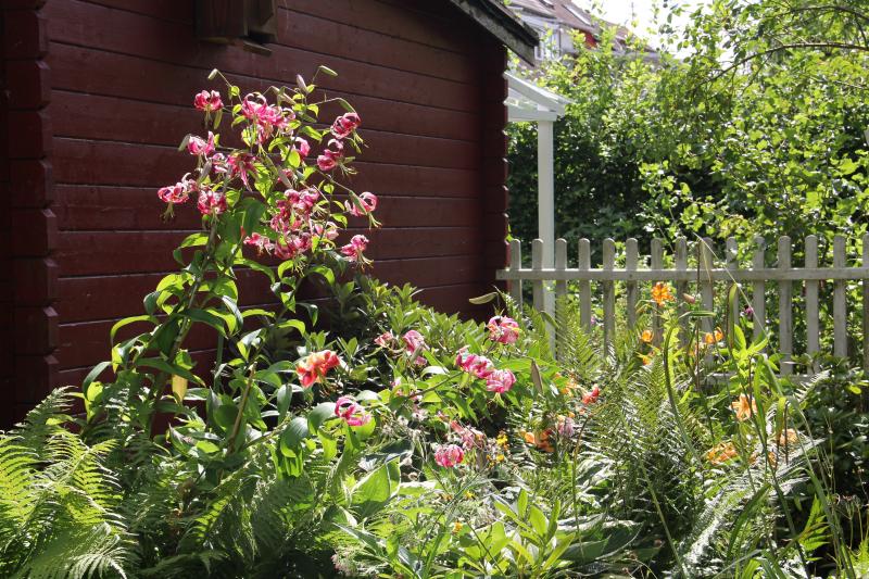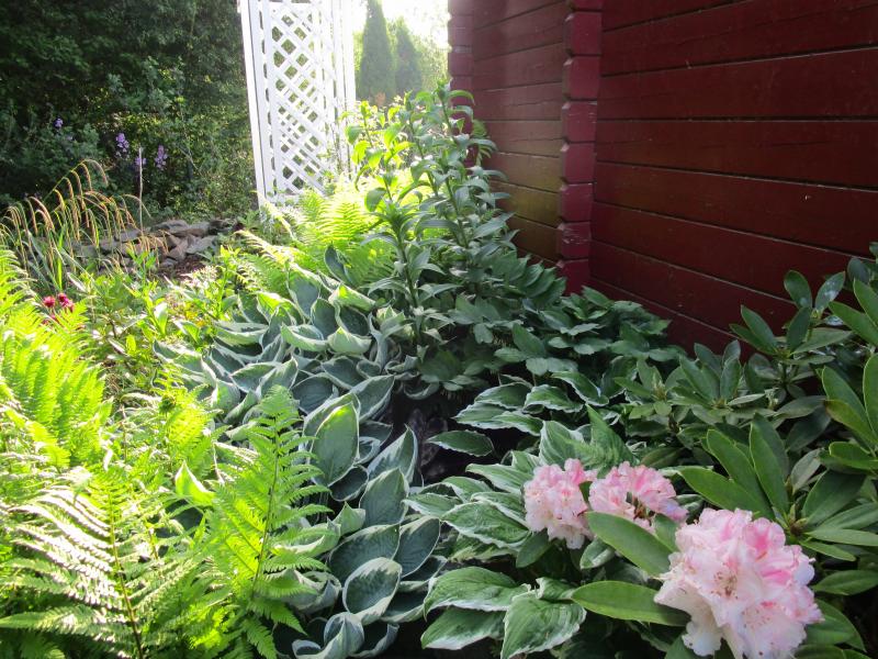 am unteren Ende unseres Gartens hatte ich einen schmalen "Waldpfad" angelegt, so wirkte der Gartenabschnitt zumindest. Auf etwa 4-6 Metern Länge zieht er sich zwischen Gartenhaus und Grundstücksgrenze hin, beidseitig betont durch ansteigend-terrassierte Anlage des Geländes. Die Seite am Gartenhaus ist eher schattig, mit Hosta, Farn, Cypripedium, Lilien und Rhododendron.
