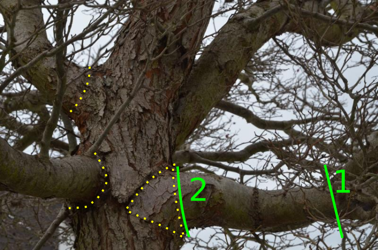 - erst etwas weiter außen den Ast absägen (1), um das meiste Gewicht zu entfernen. Das verhindert, dass beim Absägen der Ast reißt und eine Teil des zu Erhaltenden Baumstamms oder zumindest der Rinde mit abreißt.