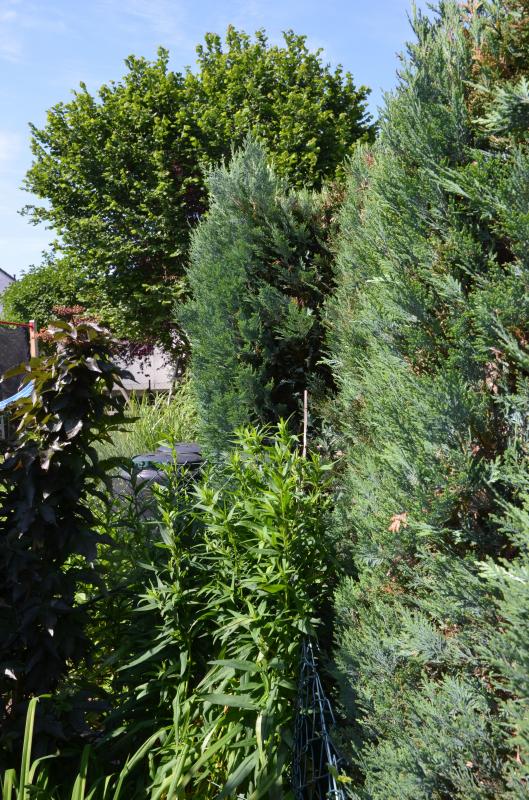 Auf dem Bild sieht man ganz gut den Breitenunterschied zum Nachbargarten, wo auch mit der Heckenschere geschnitten wird. Das Bild ist von Mitte Juni.