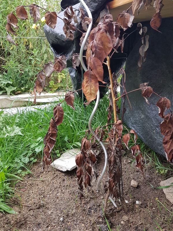 .. und so das bittere Ende (ja, ich hätte die kaputten Teile gleich rausschneiden müssen). Trockenheit kann es nicht gewesen sein, da wird regelmäßig bewässert. Ich dachte zuerst an zuviel Sonne und habe die Pflanze dann sogar beschattet.