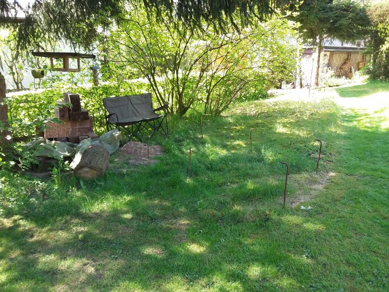 - Der Bereich ist zu 80-90 % schattig, rechts vorn (dort wo künftig der Pfeiler für die Hängematte steht) wird es jetzt bei fast Sonnenhöchststand nachmittags ab etwa 15 - 16 Uhr sonnig.