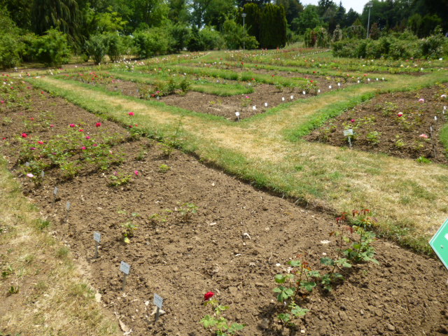 Blick auf die Sammlung der modernen Strauchrosen. Am Zustand des Rasens erkennt man gut die Trockenheit des Bodens.