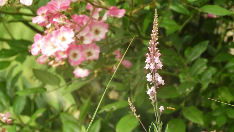 Staudiges, violett: Campanula trachelium (bei mir bisher die einzige Glockenblume die nicht von Schnecken traktiert wird), Linaria purpurea (versamt sich reichlich ist aber leicht zu entfernen, fügt sich zu Rosen schön ein).