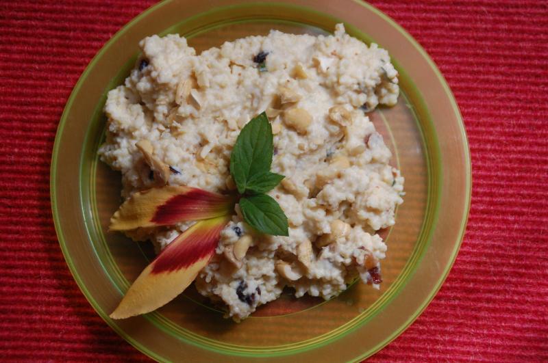 süßer Hirsebrei nach orientalischer Art (Hirse, Milch, Vanillezucker, Salz, getrocknete Datteln, getrocknete Feigen, getrocknete Berberitzen, frische Banane, Minze, Cashews, Zimt), Deko: Hemerocallis 'Nefertiti', Minze - seeehr lecker :D