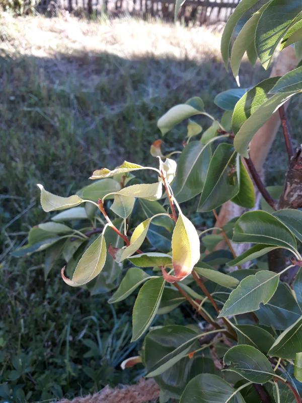 Meine Tochter pflanzte in diesem Frühjahr diese Birne in ihren Garten. Die Birne erkrankte, sie schnitt sie zurück. Das Beschwerdebild erscheint erneut.