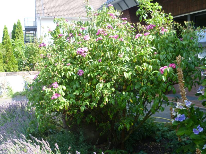 Erworben habe ich sie bei Ruf vor über 10 Jahren, es dauerte schon eine kleine Ewigkeit aber mittlerweile hat sie tatsächlich die prognostizierten 2 Meter erreicht und blüht sich jedes Jahr völlig unbekümmert so ziemlich als erste und auch als Letzte hinten raus. Sie schiebt pausenlos neue Blüten nach, selbst in diesem Sommer, wo ich wegen einer Hand OP bisher noch nicht zum Schneiden nach der ersten Blüte gekommen bin. Da vereinen sich dann an einem Zweig munter Hagebutten, Blüten und schon wieder neue Triebe mit Knospen. Nach dem Kauf konnte ich mir gar nicht vorstellen daß aus diesem Zwerg so ein stattlicher Rosenbusch wird. Dazu duftet sie noch sehr sehr gut!!!