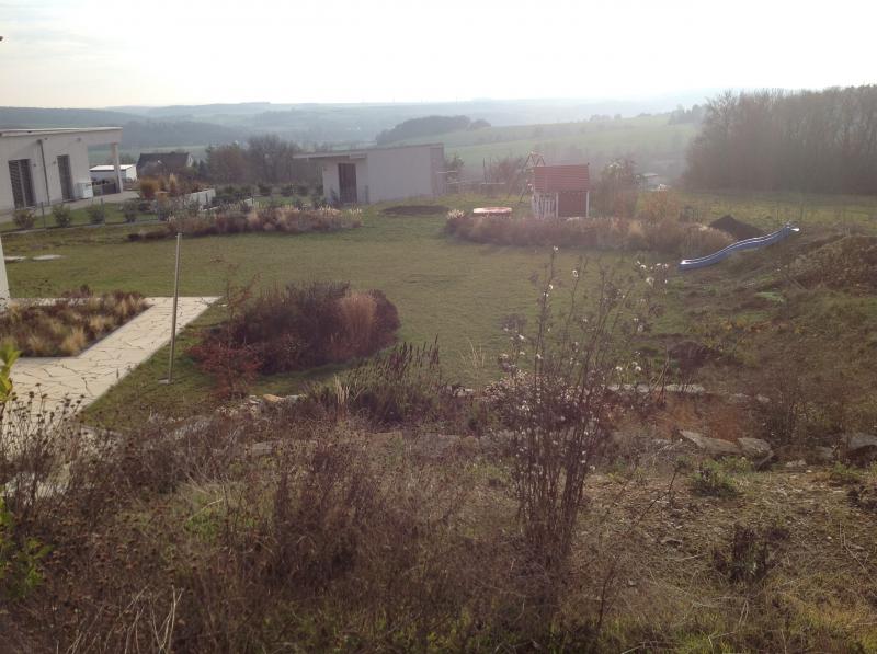 Aktuell ist hier noch Land unter, wir haben vor, im Frühjahr das Gelände anzugleichen, geplant ist eine zweite Ebene für ein weiteres Terrassenbeet gleicher Fläche, also 6,80 auf 3 m, und dann.... Tja. Mir schwebt über dem Beet dann ein Sitzplatz vor, der es zulässt, Richtung Süden den gesamten unteren Gartenteil zu überschauen. Abgrenzen möchte ich ihn mit Naturstein, welchen wir noch haben, konform zur Terrasse. Er soll vier Leuten Platz bieten, ich überlege, ihn durch eine kleine Natursteinmauer im Rücken zu begrenzen, Träume auch von einer kleinen Stellfläche für einen feuerkorb davor. Vielleicht zeige ich erst mal Bilder des areals . Als erstes den Hang, wie er grad noch ist.