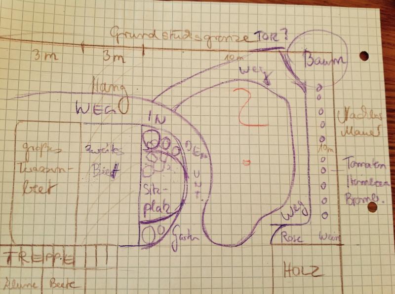 Außerdem möchte ich hinten zur Mauer hin ein bisschen nutzbeet haben, heißt da sollen Tomaten, Himbeeren und Brombeeren ihren Platz finden. Davor muss also auch ein kleiner Weg hin. Ich skizziere mal meine Überlegungen