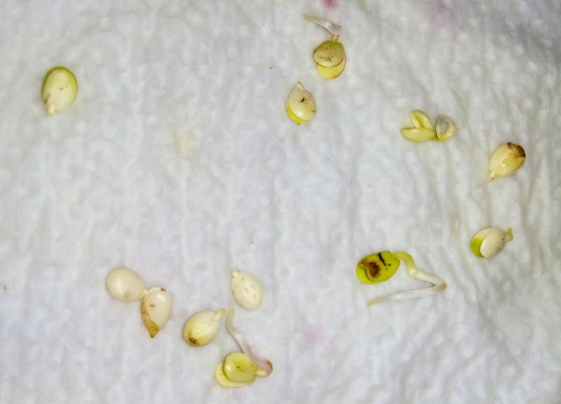 Die zwölf geschälten Samen habe ich zur Keimung in leicht feuchtes Hausrollenpapier eingewickelt und dieses in einen Zipbäutel geschoben. Das ganze Paket lagert nun bei Raumtemperatur auf einem Schrank. Eine tägliche Kontrolle ist dabei Pflicht.