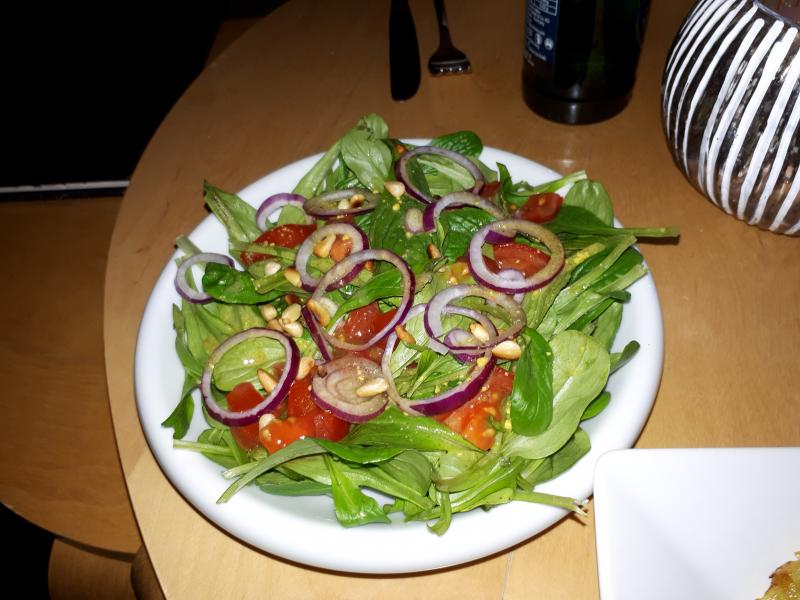 Gestern gab es das ausgefallene Weihnachtsessen. Feldsalat mit Tomaten, Zwiebeln und gerösteten Pinienkernen...