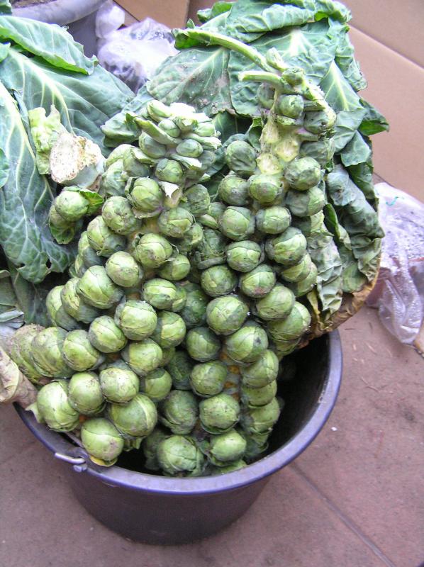 Nachdem meine GH weitgehend durchgefroren sind, habe ich nun die mitsamt Wurzeln eingelagerten Rosenkohl der Sorte "Trafalgar" - nun ohne Wurzeln - in meinen auch nicht mehr ganz frostfreien Wintergarten umgelagert ::)