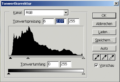 Früher, zur Zeit der Analog-Fotografie, hätte man beim Abziehen des Fotos gegengearbeitet und wieder aufgehellt ... es gab da die verschiedensten Techniken.In der Digitalfotografie machen wir das mit einer Bildbearbeitungs-Software.In Photoshop heisst die Funktion: Tonwertkorrektur.Hier ein Screenshot, wie das in Photoshop aussieht - es sieht immer ähnlich aus: