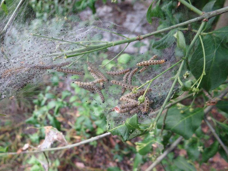 An zwei Pfaffenhütchen (Euonymus europaeus) haben wir Sonntag viele spinnenartige Gewebe mit ca. 2cm langen Raupenknäueln bemerkt, die sich offenbar von den Blättern der Bäumchen ernähren.