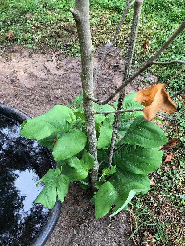 Die riesigen Blätter des Neuaustriebes erinnern mich an den Riesenwuchs der Paulownia-Blätter nach radikalem Rückschnitt bzw. bei den Jungpflanzen.