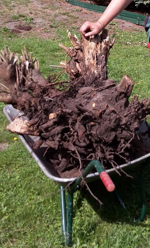 Die Entscheidung, die ausufernde Kugelweide zu roden, war schnell gefasst und umgesetzt, danach musste natürlich noch der dicke Stubben raus: