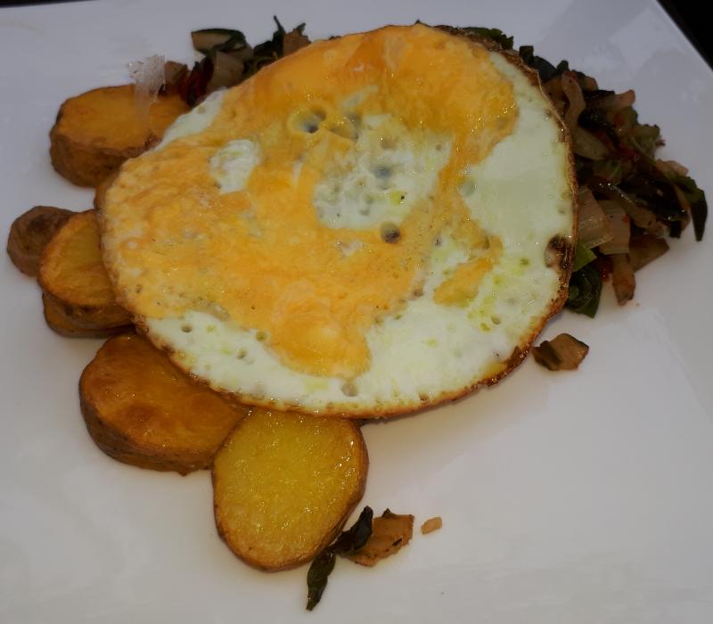 Backofenkartoffeln mit Spiegelei und Mangold, dazu Gurkensaaz