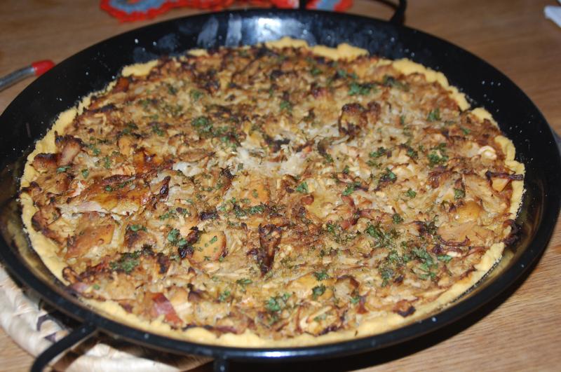 Sauerkrautkuchen (Boden: Maismehl, Maisstärke, Butter, Salz, Paprikapulver, Wasser (war ein glutenfreier Versuch - naja - essbar, geschmacklich akzeptabel, aber kein gleichwertiger Ersatz für normalen Mürbeteig ::)); Belag: Sauerkraut, gegrilltes Hähnchen, Apfel, Ei, Petersilie, Salz)