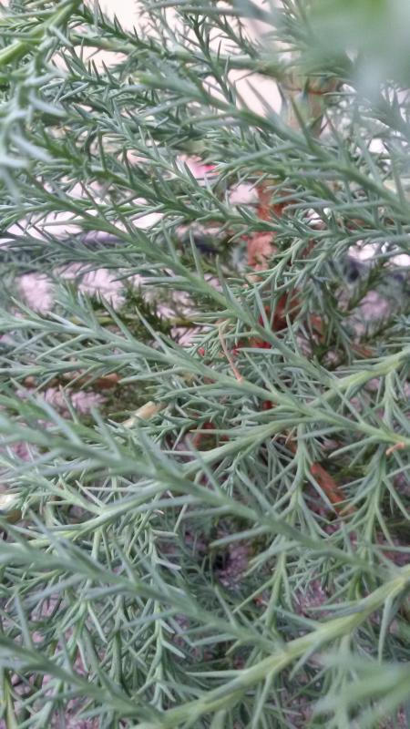 Im August waren es dann leuchtend braunrote Bereiche, die mich so sehr störten, dass ich die Bäume alle von Hand "putzte", also die braunen Triebe abstreifte, deshalb gibt es kein Foto von dem Zustand.