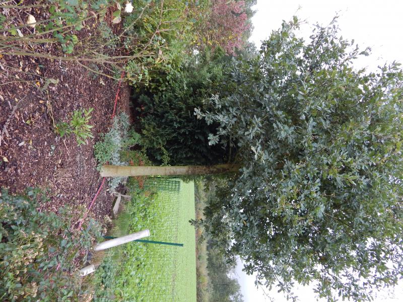 Mein Gedanke fällt auf die Fläche rund um die Eiche, die sich selbständig entschieden hat, genau an dieser Stelle zu wachsen. Der Lebensbaum daneben kann gerne weichen und umgelegt werden. Die hellen Rohre gehören zur Belüftung der hauseigenen Kläranlage. Geruchsbelästigung habe ich nicht bemerkt.