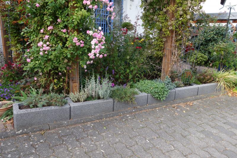 Das Bild von 2014 gibt einen Eindruck, auch wenn vieles inzwischen anders gestaltet ist. Die Wisteria ist leider verstorben, die Buchshecke rechts nach Zünsler-Befall entfernt worden.