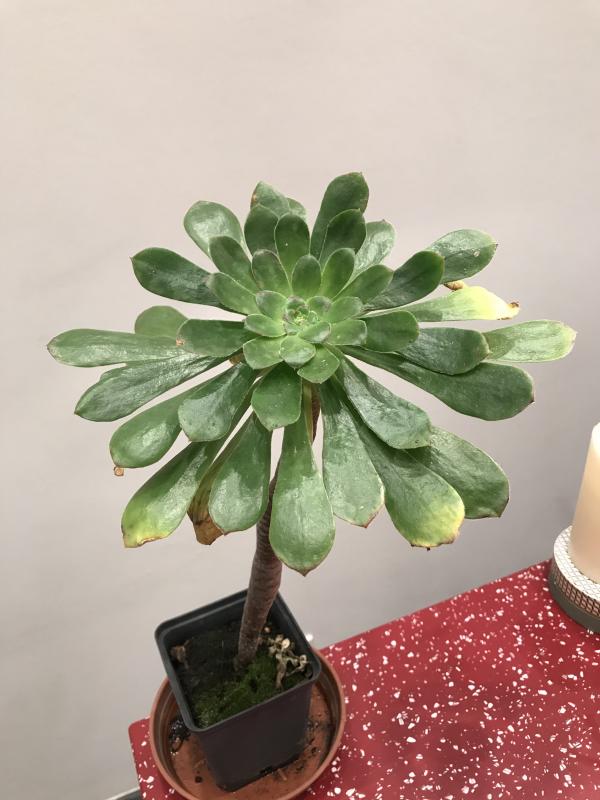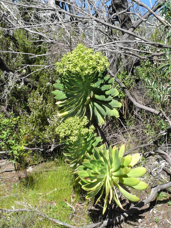Das ist vermutlich eine andere Art, wie die vorhergezeigte, auch von Teneriffa, wuchs aber an einem steilen Hang, wie ein Steinbrech... der Wuchs ist also eher untypisch, hat inzwischen einen ca. 20 cm hohen Stamm. ;)