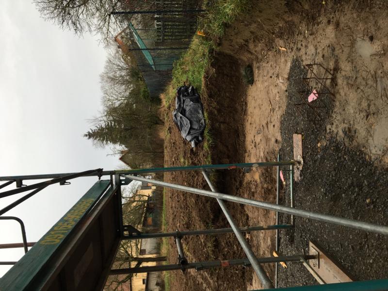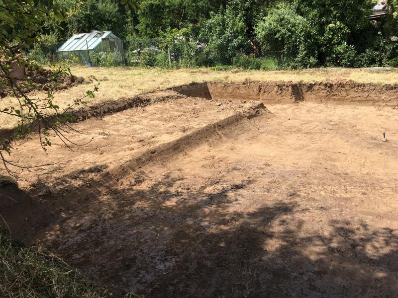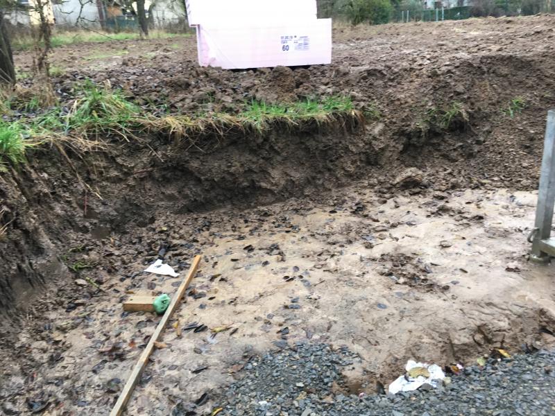 Beim Aushub des Fundaments stellte sich jetzt die Frage, wohin damit? Einige Bauern im Dorf hatten großes Interesse an der Erde und haben sie in großen Mengen abgeholt um sie auf ihre Äcker zu streuen. Das war im Sommer. Aufgrund von Bandkeramik-Funden mussten dann die Aushubarbeiten pausieren und vorübergehend von Archäologen übernommen werden. Anschließend hat der Rohbauer den Rest ausgehoben. Das war im Herbst und da die Bauern schon ihre Saat ausgebracht hatten, bestand kein Interesse mehr an der Erde.