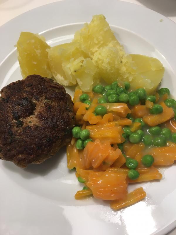 Be uns auch Fleischküchle, mit Salzkartoffeln und Erbsen-Karottengemüse