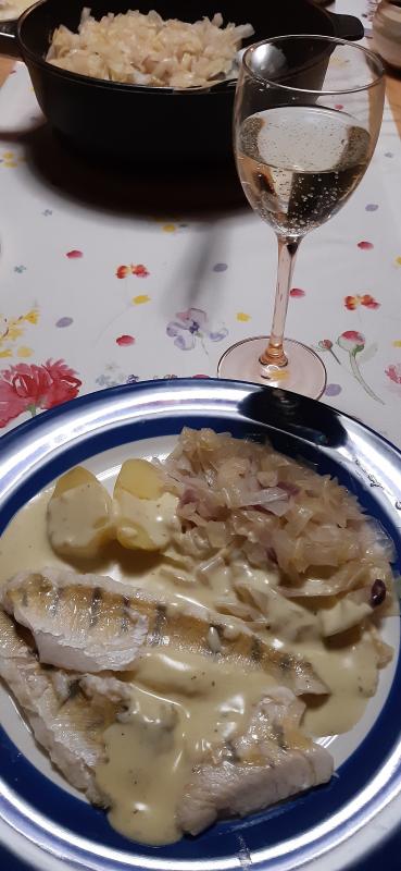 Hier gab es Zander, Senfsauce, Kartoffeln, Spitzkohl mit einem Hauch Cumin.