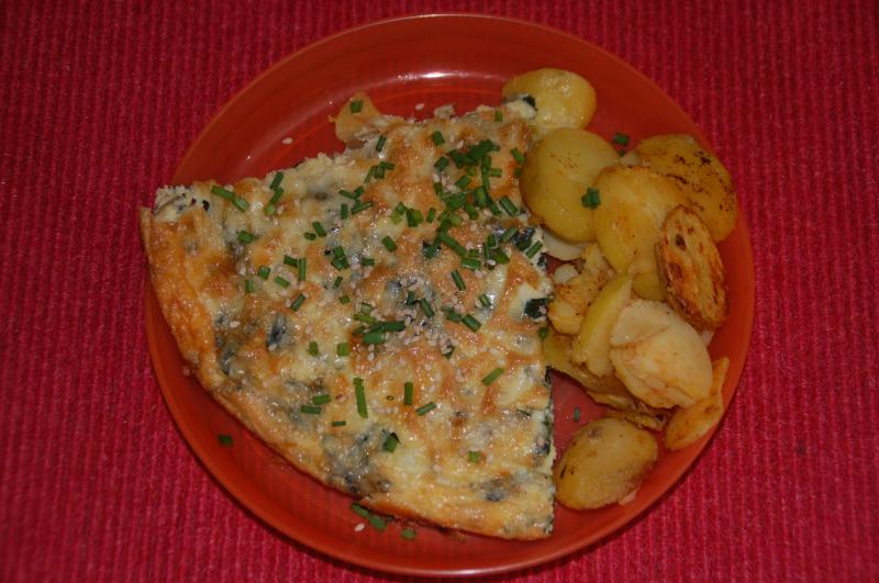 Spinat-Omelette (frischer Spinat, Zwiebeln, Knoblauch, Cheddar, Eier, Creme fraiche, Sesamöl, Salz, Zitronenpfeffer, Sesam, Schnittlauch) mit Bratkartoffeln (Pellkartoffeln, Öl, Salz, Pfeffer, Paprika)