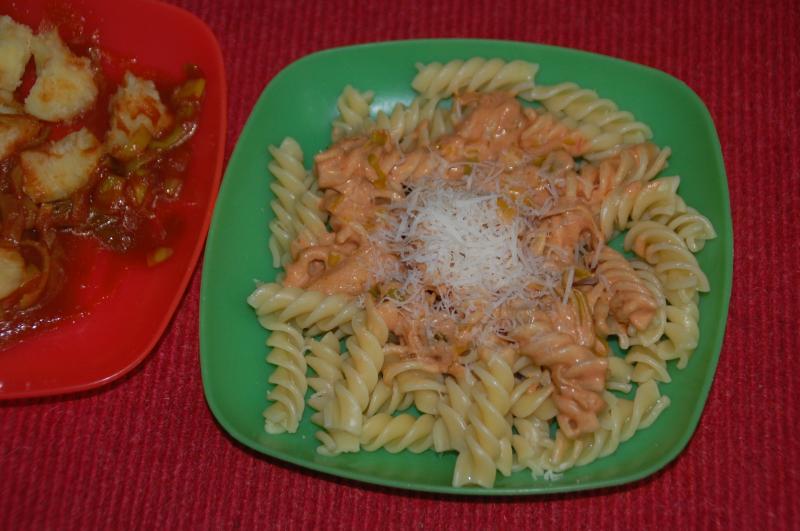 Fusilli mit Lauchsoße (pass Tomaten, Porree, Frischkäse, Currypulver, Salz, Butter) und Parmesan