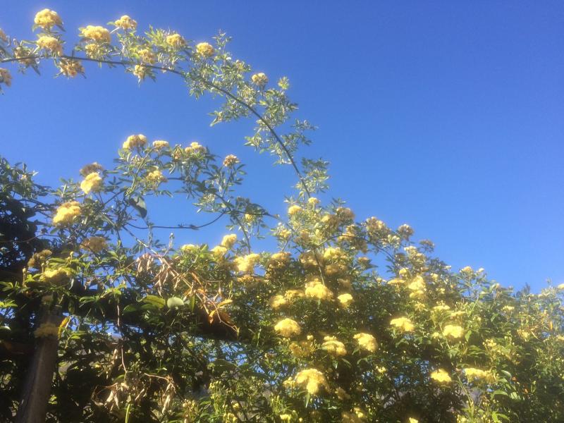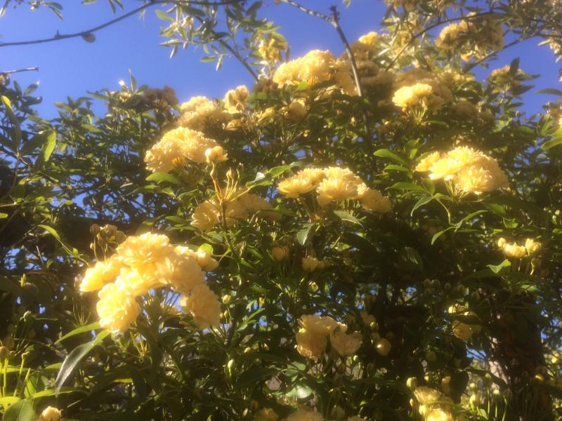 Bei mir blüht ab April die Rosa banksia lutea