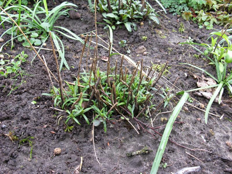 Hier im Vergleich der Austrieb von Phlox divaricata 'Chattahoochee'. Hier gab es offensichtlich Verwirrung, weil 'Moody Blues' früher auch unter diesem Namen unterwegs war. Sie unterscheiden sich aber deutlich. Ich dachte eigentlich, ich hätte 'Chattahoochee' verloren, aber unter einem verschleppten Austrieb von Phlox paniculata 'Miss Holland' tauchte etwas auf, was absolut nicht dazu passt. Und gleich mit dem passenden Stecker versehen.