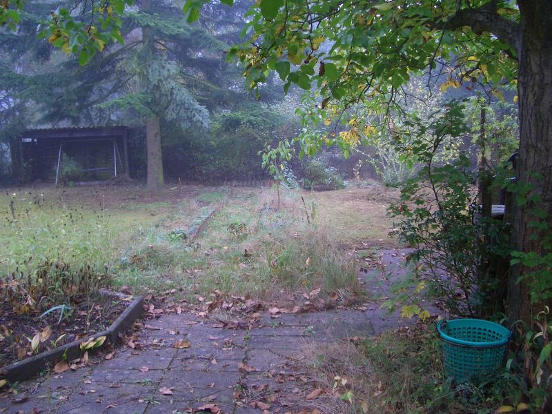 Direkt nach der Übernahme aus der kurzzeitigen Verpachtung. Reste von Spielzeug. Die ehemals nette kleine Tanne ist übermäßig groß geworden. Ehemalige Wegestrukturen sind fast untergegangen. Rechts hinter der Spielmuschel wurde eine Süßkirsche in die ehemalige Rosenrabatte gepflanzt.