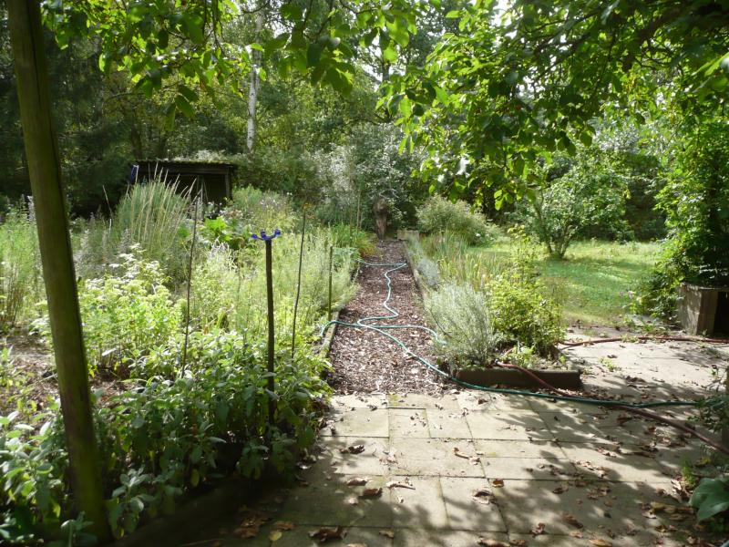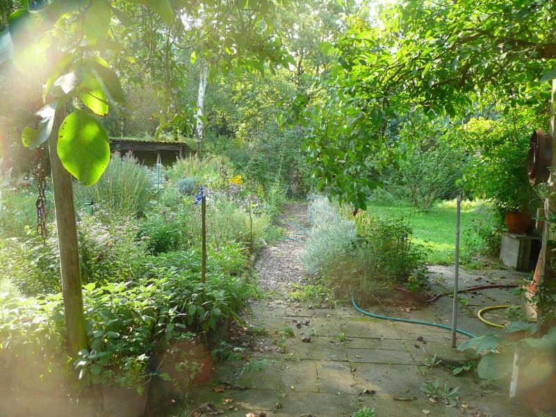 Das Lama ist unter einem Berg Efeu verschwunden. Die Birke rechts vom T-Haus sieht man auch nicht mehr vor lauter Efeu. Links des Weges kommt in das Irisbeet so langsam Ordnung. Gleichwohl sind der Garten und ich in gewisser Weise an einem Tiefpunkt.