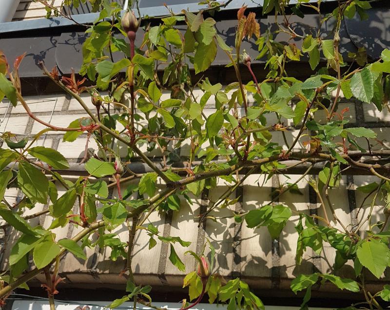Meine empfindlicheren Rosen zeigen noch keine Schäden: im Osten Crepuscule und Plaisanterie, im Westen die Little White Pet und Mme Alfred Carriere. Bin gespannt, was noch kommt, denn in meinem Garten neigen Rosen zu blinden Trieben, verursacht durch vermutlich Frost.